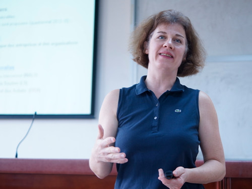 Mme.Chanut首先介绍了她自己的教学和研究任务,以家乐福为例,简单说明物流的基本运营、分销,并且深化物流定义并不是仅仅与运输有关,而是包括两个方面:物资商品流和信息流的控制。