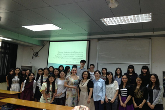 本网讯 10月24日上午,圣彼得堡国立大学国际关系学院国际政治系娜塔莉亚·卡瓦列夫斯卡亚副教授做客广东外语外贸大学俄语中心,为我校50多名俄语系大四学生做了一场以“语言与国家软实力”为主题的讲座。出席讲座的还有俄语中心主任杨可教授、俄语系郭利老师。