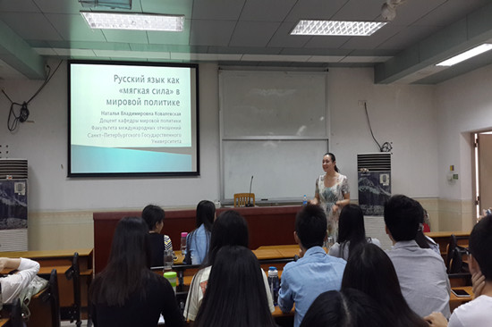 娜塔莉亚·卡瓦列夫斯卡亚副教授首先向同学们介绍了国家软实力的概念。她指出,在全球化的大背景下,语言和文化作为国家软实力的重要组成部分具有越来越突出的意义。接下来,娜塔莉亚·卡瓦列夫斯卡亚副教授通过展示大量图片,生动有趣地分析了不同国家加强自身软实力的做法,着重分析了俄罗斯在此方面所采取的战略和措施。最后,她引出结论:在国际政治中俄语和俄罗斯文化是俄罗斯国家软实力的基础。