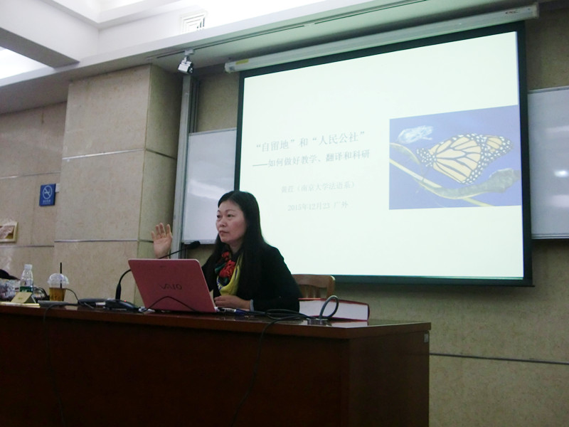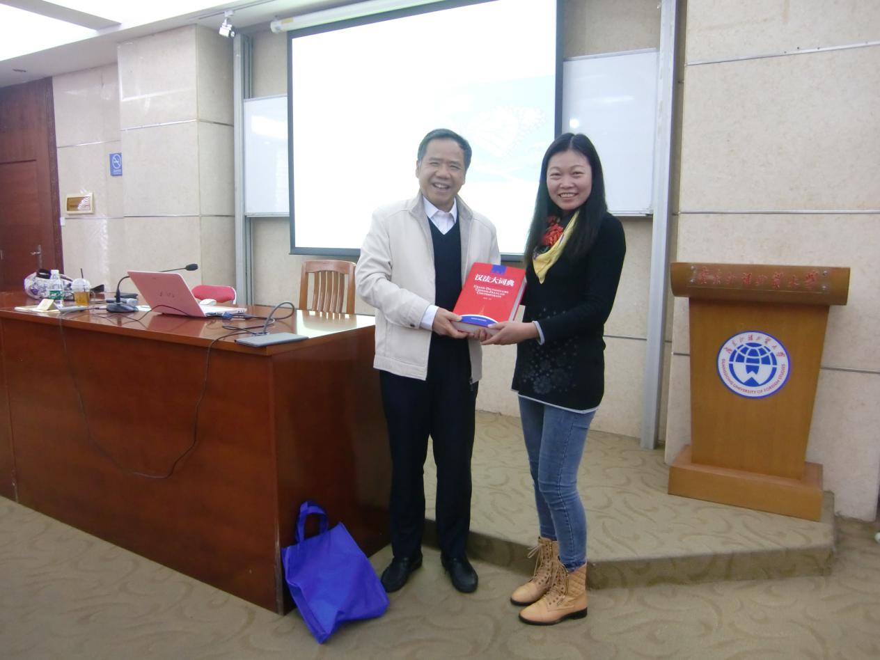讲座由广东外语外贸大学法语系学科带头人郑立华教授主持。郑立华教授对黄荭教授在翻译理论和实践方面取得的成绩大加赞赏,并提醒在场的研究生抓住此次难得的机会向黄荭教授取经。对黄荭教授进行介绍之后,郑立华教授代表法语系向黄荭教授赠送了由我校著名教授黄建华主编并签名的《汉法大词典》。