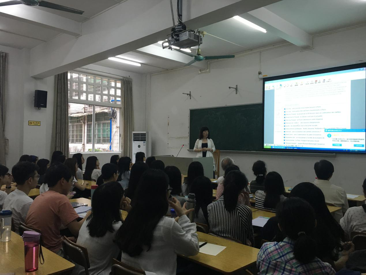 本网讯 继法语MTI系列讲座前三讲获得成功以后,法语系特邀法国电视二台France 2驻京记者站制片人常静来我校讲学。2016年5月09日,常静以《如何利用电视资源学习语言,积累知识,提高翻译能力》为题,为我院师生奉献了一场精彩的学术讲座。该讲座在北校4教116举行,西语学院教职员工和学生参与了本次讲座。