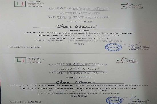本网讯 10月21日下午,由意大利驻华使馆文化处主办的第四届“意大利语桥”——全国高等院校意大利语言与文化知识竞赛在北京举行。我校西语学院意大利语系学生陈婉霓夺得一等奖,并获最佳发音奖。