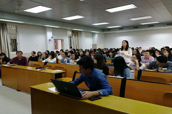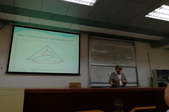 Christiane Nord教授先通过交流模型示意图介绍了交流过程实现的原理,借助实例讲解符号发送者和符号接受者的关系,符号的指称功能,表情功能,寒暄功能,呼吁功能,以及这四大功能的实现基础及在目标文化中的使用。接着介绍了翻译的决策过程,即翻译任务的解读,翻译类型的选择,翻译形式的选择及翻译问题的解决,并分别以德译唐诗《栾家濑》和德国谚语Liebe durch den Magen为例介绍了不功能翻译策略下的不同译文效果。最后对专题进行了提纲挈领的总结。教授详实的内容,清晰的脉络,生动的语言,有趣的例证,体现了其学术造诣的深厚,为我院德语专业学生打开了通往新知识领域的窗户,拓宽了知识视野,有利于外语能力的提升。