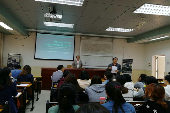 本网讯 11月8日下午,德国功能翻译学派代表专家Christiane Nord教授应邀到访我校讲学,于西方语言文化学院424报告教室为我院德语语言文学专业的师生做了题为“翻译作为目的性行为--功能翻译学导论”的专题讲座。