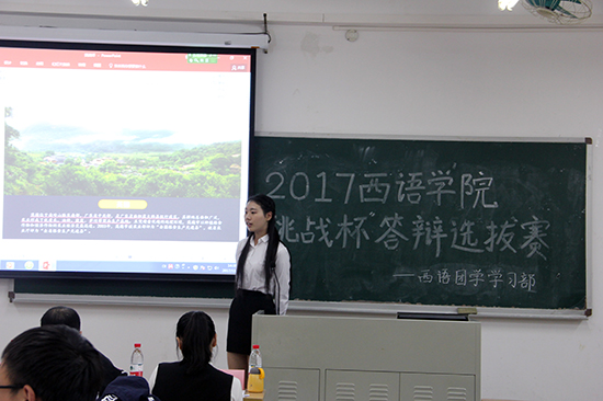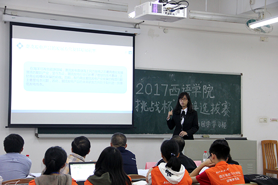 本网讯 2017年西语学院“挑战杯”答辩选拔赛于11月16日下午两点在北校区第六教学楼B211正式开始。到场的评委老师有:西语学院党委书记方华老师、西语学院党委副书记陈华荣老师、西语学院团委书记王斌龙老师、西语学院辅导员陈静老师以及西语学院辅导员张悦欢老师。
