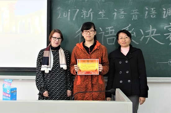 最后,两位评委为前三名选手颁奖,前三名分别是:袁孝铭、钟渝佳、张钰晨。希望同学们能够再接再厉,日后以更饱满的热情投入到塞语的学习中!