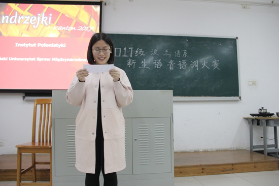 本网讯 2017年11月27日晚,西方语言文化学院波兰语系2017年新生语音语调大赛于六教B202成功举办。本次大赛旨在检验同学们的语音语调学习成果,提高同学们的语言运用能力。本次大赛邀请到了华沙大学波兰语言文学系教授伊丽莎白·森科夫斯卡、波兰语系外教宝琳娜·海赫瓦奇以及波兰驻广州领事馆总领事助理戴安娜阿西女士担任评委,波兰语系系主任茅银辉老师、外教阿格涅什卡·雅辛斯卡以及教师张和轩出席本次大赛。
