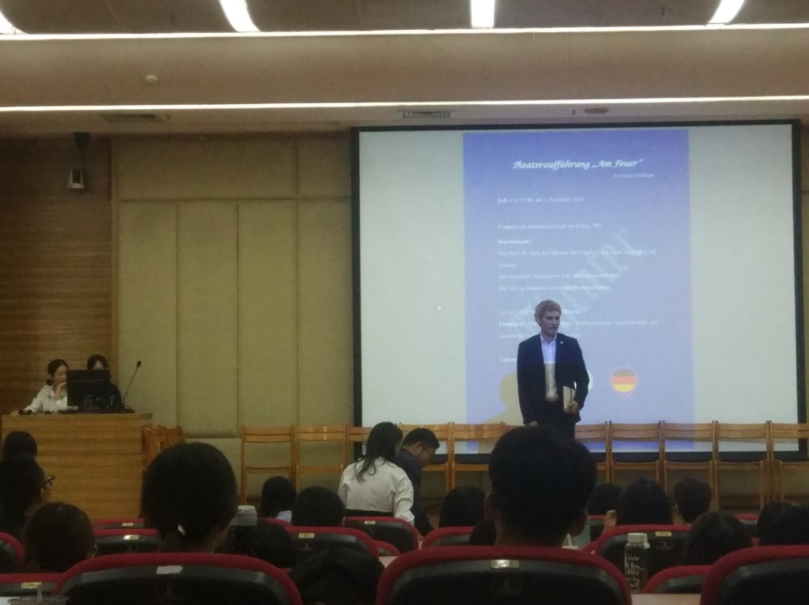 本网讯 在德国驻广州领事馆、DAAD以及西方语言文化学院德语系的共同努力下,德国演员、剧作家同时在德国慕尼黑大学担任戏剧学院教师一职的Diez先生受邀与德语系二、三年级的同学开展了为期十天的戏剧工作坊活动,并于2018年11月1日下午在图书馆负一层报告厅进行了汇报演出。