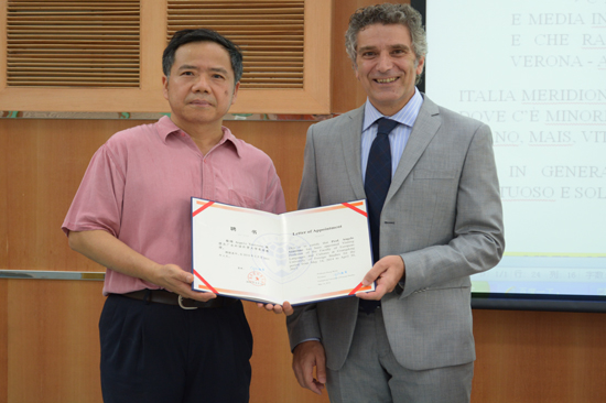 本网讯 6月5日,意大利语客座教授聘任仪式在广外北校MBA教学楼丝纺讲堂举行。西方语言文化学院院长郑立华郑重地将客座教授聘任证书授予来自意大利马切拉塔大学的博士后教授Angelo Ventrone 。