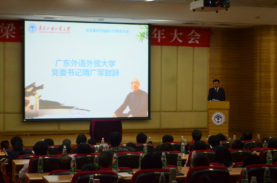 本网讯 11月2日,在梁宗岱老先生诞辰110周年之际,我校于广外图书馆负一层多功能报告厅主办了此次学术研讨会来缅怀先生,让更多广外学子了解梁宗岱先生在中国翻译史,诗史以及教育史上做出的伟大贡献。出席本次研讨会的领导有广东外语外贸大学校长仲伟合,党委书记隋广军,党委副书记陈建平,副校长许国彬及我院院长郑立华。
