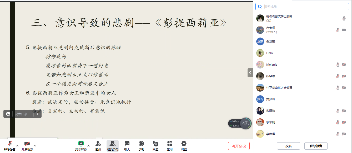 讲座中,任卫东教授首先介绍了克莱斯特的生平及康德哲学对克莱斯特的重大影响,接着以克莱斯特的三部作品 --- 《论木偶戏》、《彭提西莉亚》以及《海尔布隆的小凯蒂》为切入点,对作品的人物形象所体现出的意识与无意识进行了详细的解读。任卫东教授指出,克莱斯特在作品中呈现了人的意识和无意识导致的种种后果,体现了他对人的意识的怀疑以及对人类历史发展的思考。在讲座的讨论环节,任卫东教授还与师生就作品内容开展了进一步的探讨。