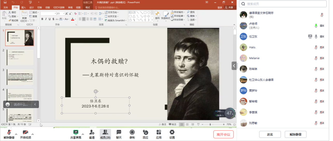 本网讯 6月28日上午,西方语言文化学院在线上开展了德语系实践周学术讲座,北京外国语大学任卫东教授应邀开展了一场题为《木偶的救赎---克莱斯特对意识的怀疑》的学术讲座。讲座由西语学院副院长卢铭君教授主持,学院多名中青年教师、本硕学生参与讲座。