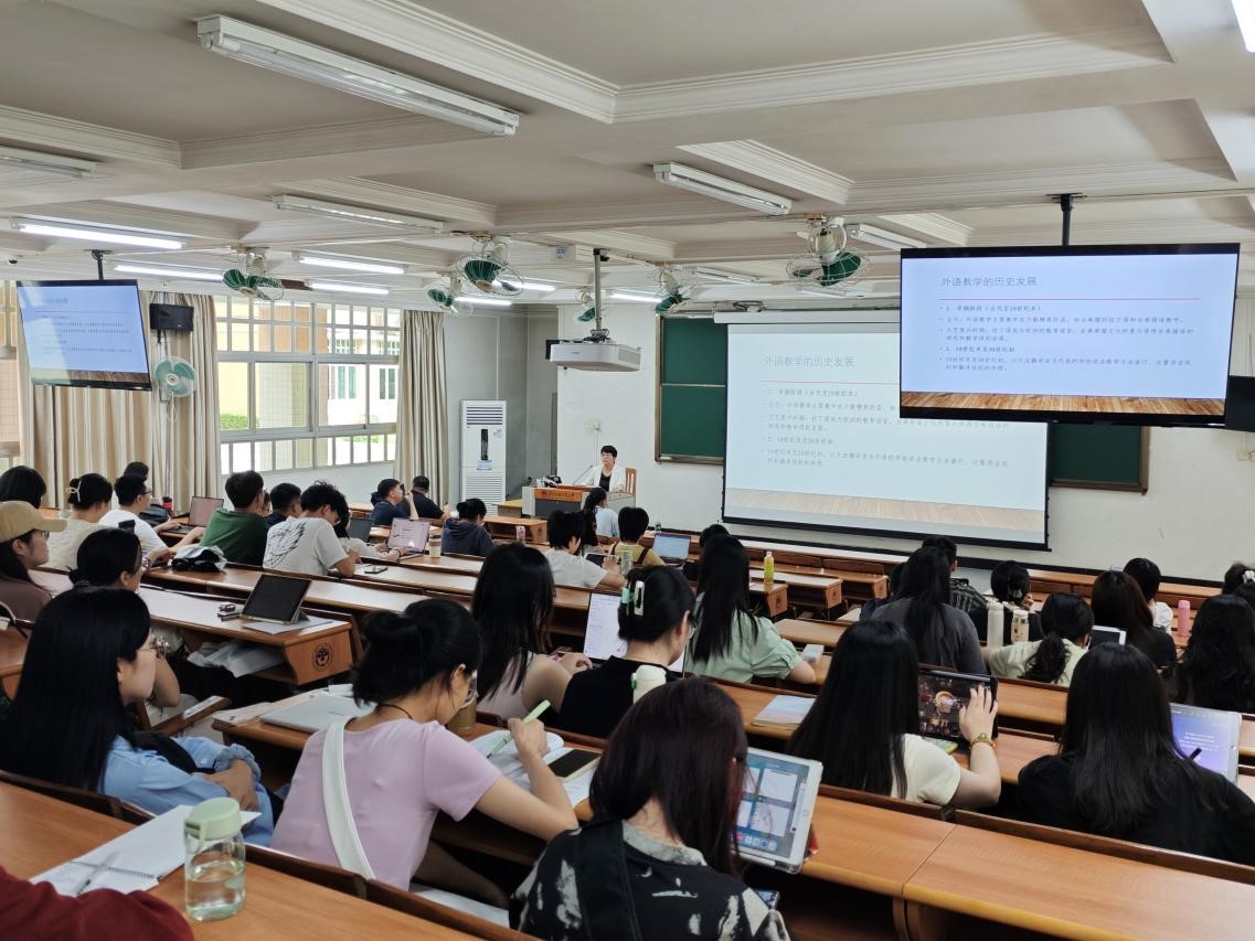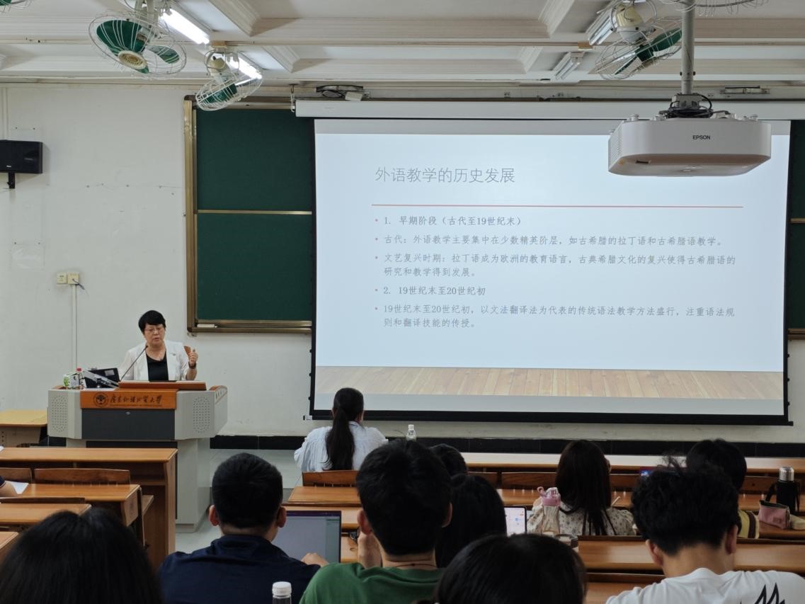 本网讯:2024年5月10日下午,由广东外语外贸大学西方语言文化学院研究生办公室组织的“宗岱人文讲坛:外语教学法工作坊研究生系列讲座第一讲”在北校区二教116教室成功举行,俄语系石树教授为本次讲座主讲人。讲座由西方语言文化学院院长杨晓敏教授主持,副院长臧宇、研办主任刘巍、研究生辅导员杨潇及西语学院硕士研究生到场参与。