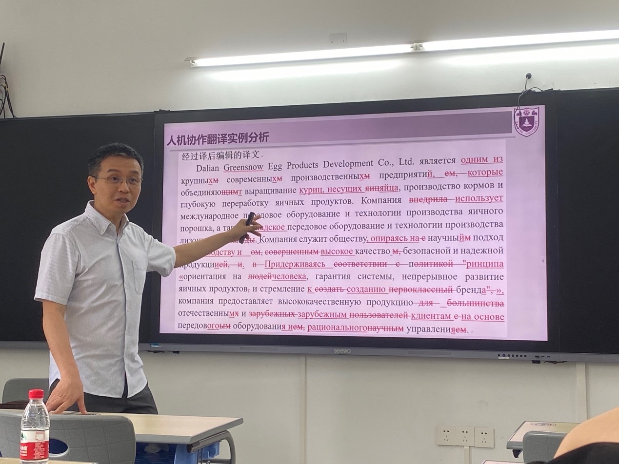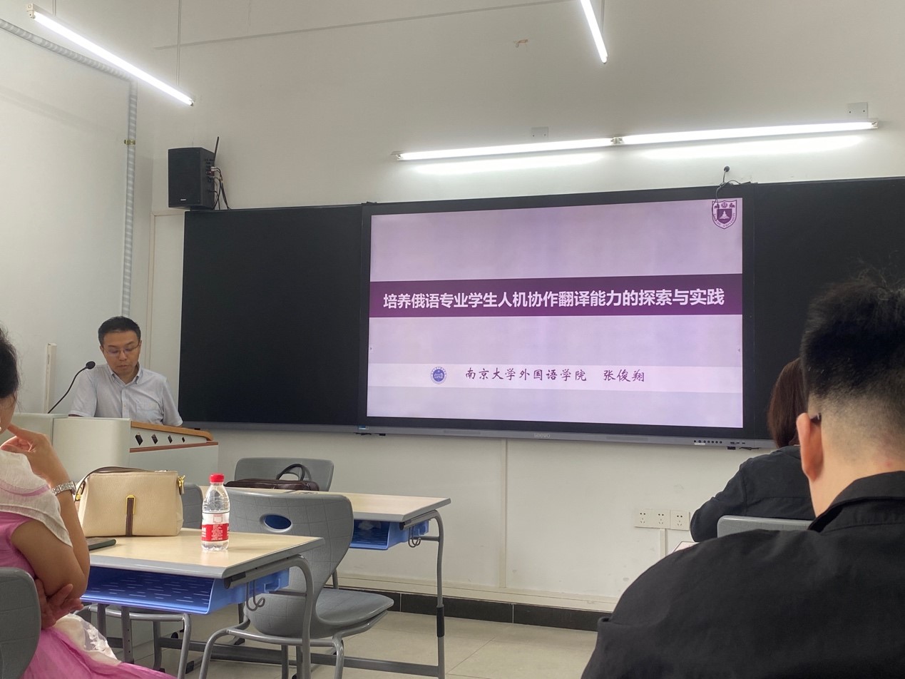 本网讯 2024年6月6日上午10:00,南京大学外国语学院副院长、中国俄罗斯东欧中亚学会俄语教学研究会常务理事、中国高等教育学会外语教学研究分会理事、中国中外文艺理论学会巴赫金研究分会理事张俊翔教授在一教南楼218教室为俄语系师生带来宗岱翻译讲坛学术讲座“培养俄语专业学生人机协作翻译能力的探索与实践”。本次讲座由俄语系系主任陈欢副教授主持,师生积极参与互动,现场氛围活跃。