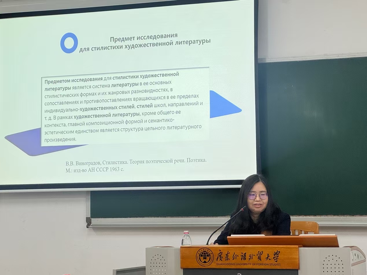 本网讯 2024年12月20日上午10:00,北京外国语大学俄语学院党总支书记、博士生导师、2024俄罗斯普希金奖章获得者、教育部外国语言文学类专业教学指导委员会委员、俄语专业教学指导委员会副主任委员黄玫教授在白云山校区六教B202教室为俄语系师生带来宗岱人文讲坛“文学修辞学视角下的文学研究”。 本次讲座由俄语系系主任陈欢副教授主持,师生积极参与互动,现场氛围活跃。