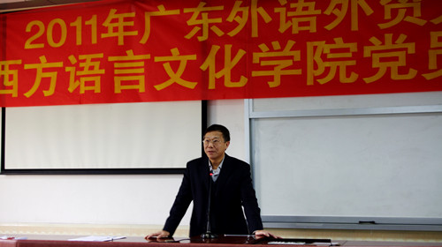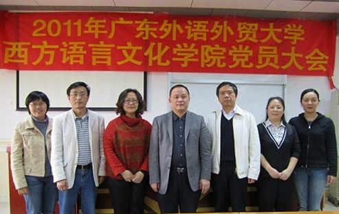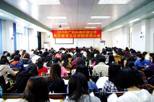 本网讯 为了总结学校过去三年的党建工作,并确立未来几年为建设高水平的教学研究型学院的发展方向,推选新一届党委委员及第三届党代会西语学院代表。3月31日,下午两点,2011年广东外语外贸大学西方语言文化学院党员大会,在四教424准时举行。学校党委副书记陈建平,西语学院党委书记方华,副书记郝建萍,西语学院院长郑立华,副院长刘齐生、杨可等领导及教职工、学生党员参加了本次大会。