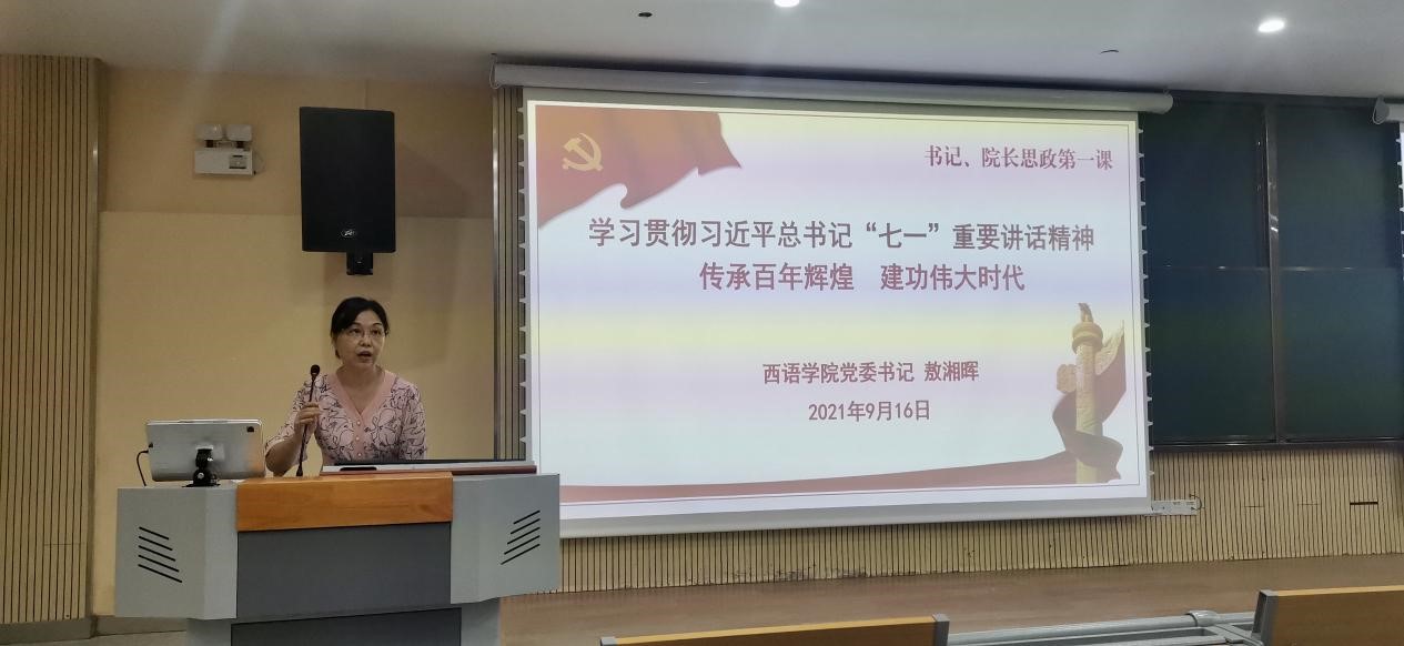 2021年9月16日下午,西语学院在一教109举行书记、院长“思政第一课”。学院党委书记敖湘晖、院长杨可、研究生辅导员张阳和2021级研究生新生们共计106人参加“思政第一课”学习。
