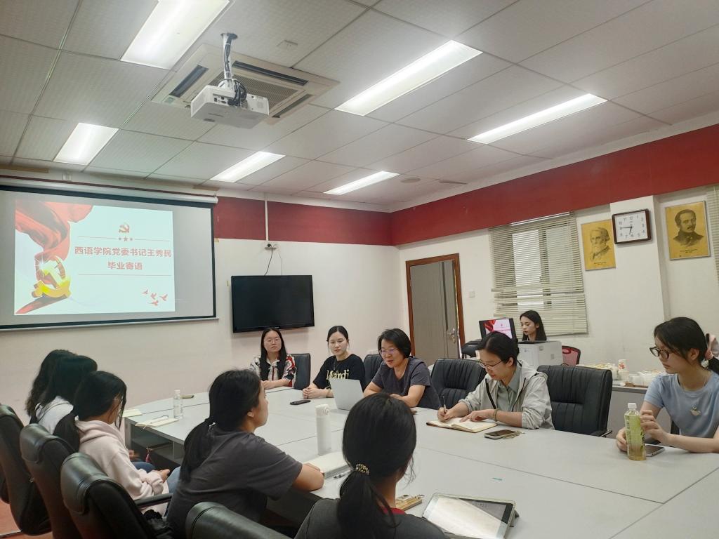 本网讯 5月27日下午,结合毕业生党员“远航行动”,西语学院在四教320召开“讲党性、树榜样、话未来”2025届毕业生党员主题教育。学院党委书记王秀民,党委副书记魏少娟,党委委员、组织员倪娉婷,以及全体毕业生党员共计60余人线上线下参与本次主题教育。