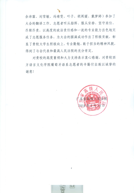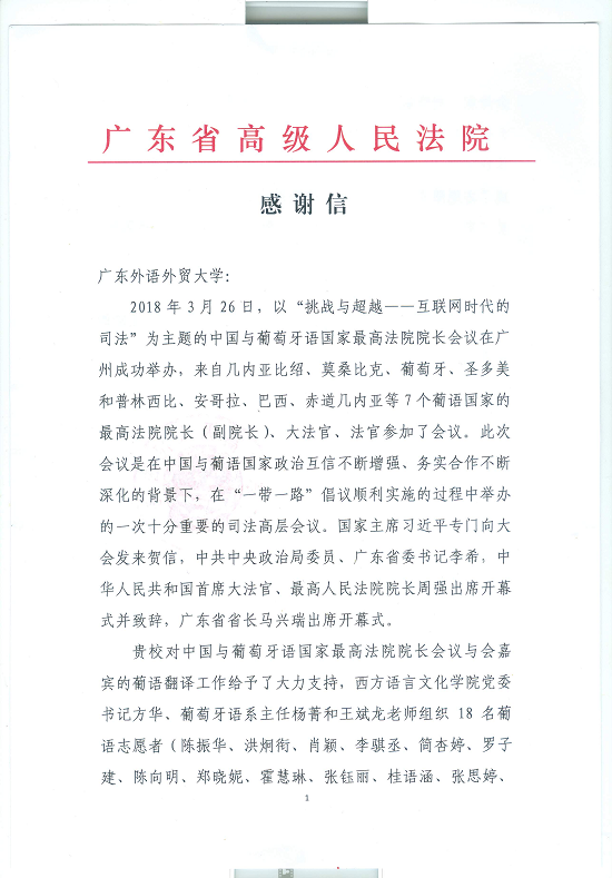 本网讯 近日,广东省高级人民法院发来感谢信,对我院党委书记方华老师、葡萄牙语系主任杨菁老师、团委书记王斌龙老师组织学生参加中国与葡萄牙语国家最高法院院长会议翻译志愿活动 和葡萄牙语系15名14级大四学生和3名16级大二学生在本次会议提供的翻译志愿活动和所作出的努力表示感谢。