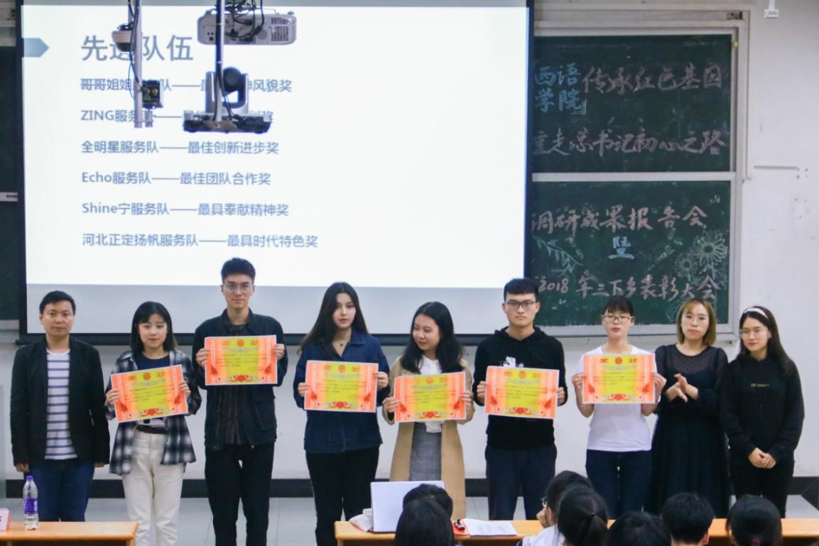本网讯 11月29日晚19点,筹备已久的2018年暑期“三下乡”社会实践活动成果展示暨表彰大会在二教219隆重举行。西语学院党委副书记陈华荣老师、西语学院团委书记王斌龙老师、西语学院辅导员张悦欢老师和西语学院辅导员倪娉婷老师出席了本次活动。