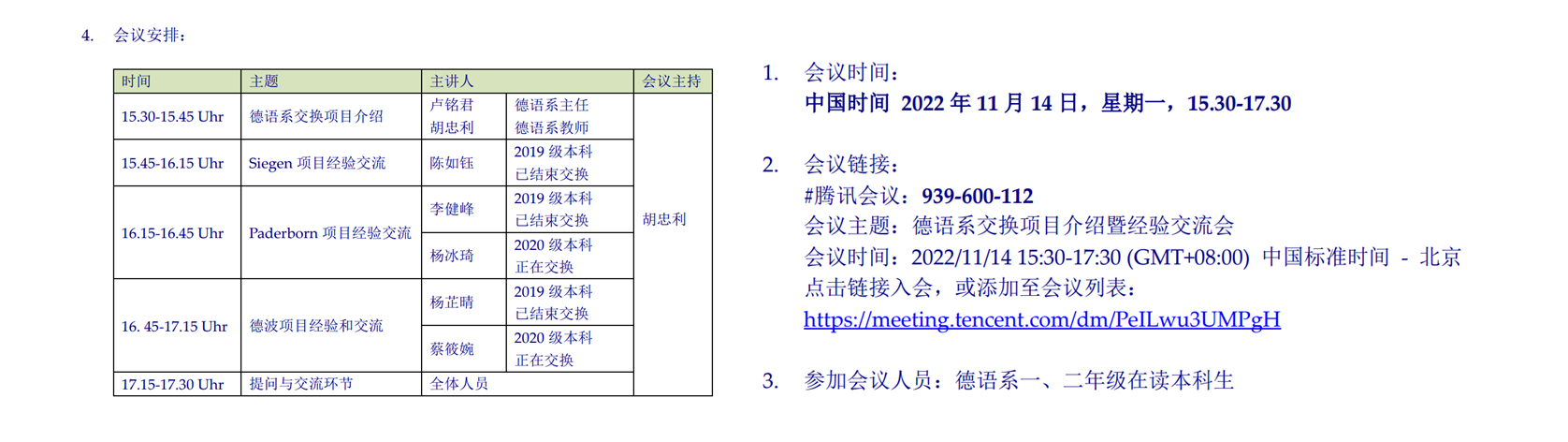 本网讯 2022年11月14日下午,德语系通过线上会议形式顺利举办了“德语系学生交换项目介绍暨经验交流会”。此次交流会旨在向德语系一、二年级在读本科生同学介绍德语系目前的出国交换学习项目以及选拔条例,推进2023-2024学年度的本科生出国交换学习工作,保障同学们在充分了解交换项目的基础上提前为出国交换学习做好准备,以便从容应对各种挑战,从而顺利完成出国交换学习。