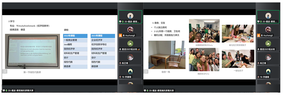 2019级的陈如钰同学从交换项目的前期准备、在锡根的课业与学习,以及在锡根和德国的生活环境,甚至包括具体的费用支出,与同学们详实地分享了自己在锡根交换学习的宝贵经验。2019级的李健峰同学和2020级的杨冰琦同学深入浅出,结合自身经历和体验,分享了交换学习生活的点点滴滴、遇到的困难和解决方案,以及对个人发展规划的思考。2019级的杨芷晴同学和2020级的蔡筱婉同学从交换申请流程到资料准备以及抵达德国和波兰后的具体课程和生活等方方面面图文并茂地介绍了德波项目的具体情况。