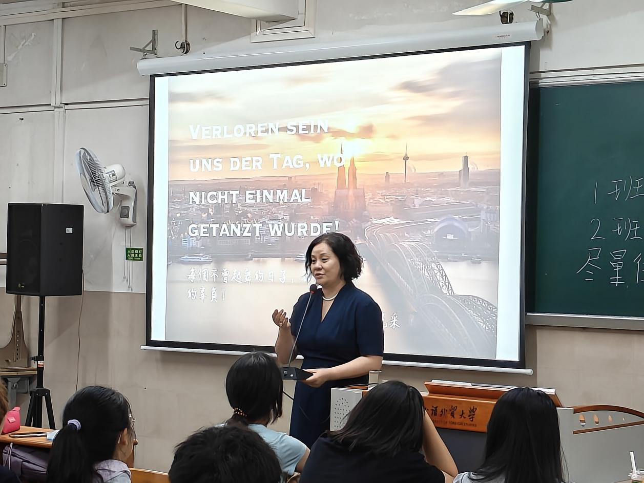 随后,滕奕丹老师做出了简短精扼的发言。滕奕丹老师表示,德语学习已经成为推动中德两国交好、推动两国社会进步的关键途径之一,相信全体同学们将在学院接触先进德语教育领域的前沿问题,在学习科研中与导师与同学们勠力同心,共同推动广外德语专业的建设,为我国建设成为国际化强国贡献力量。