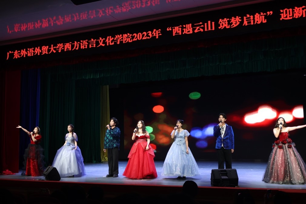 本网讯 2023年11月3日19:00,西方语言文化学院“西遇云山,筑梦启航”迎新晚会于白云山校区六教报告厅隆重举行。西语学院副院长臧宇,西语学院党委副书记魏少娟,西语系系主任吴凡,俄语系系主任陈欢,意语系系主任张海虹,葡语系系主任尚雪娇,法语系王永康,德语系黄羽欢,波兰语系梁小聪,西语学院团委书记、辅导员王斌龙,辅导员张阳、冯迪南、杨潇莅临本次晚会,与西语学子共同欣赏精彩纷呈的迎新晚会节目。