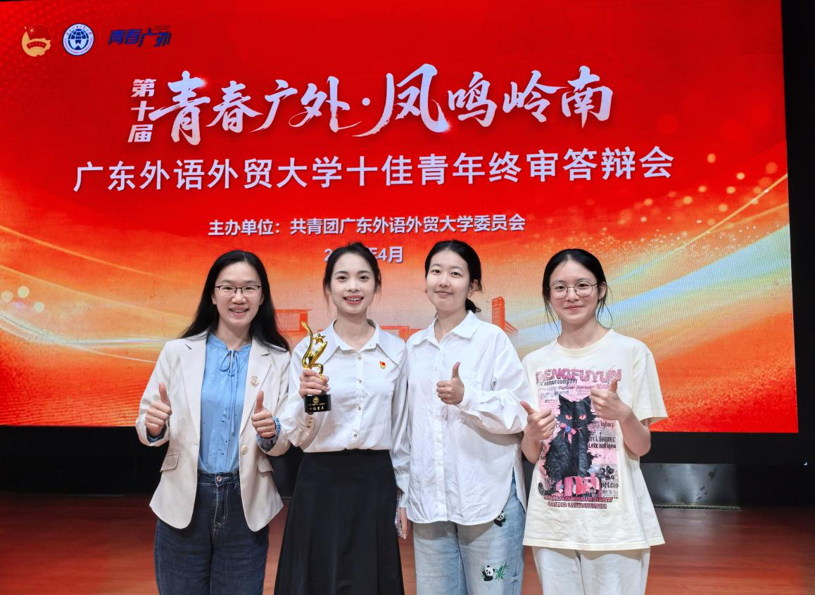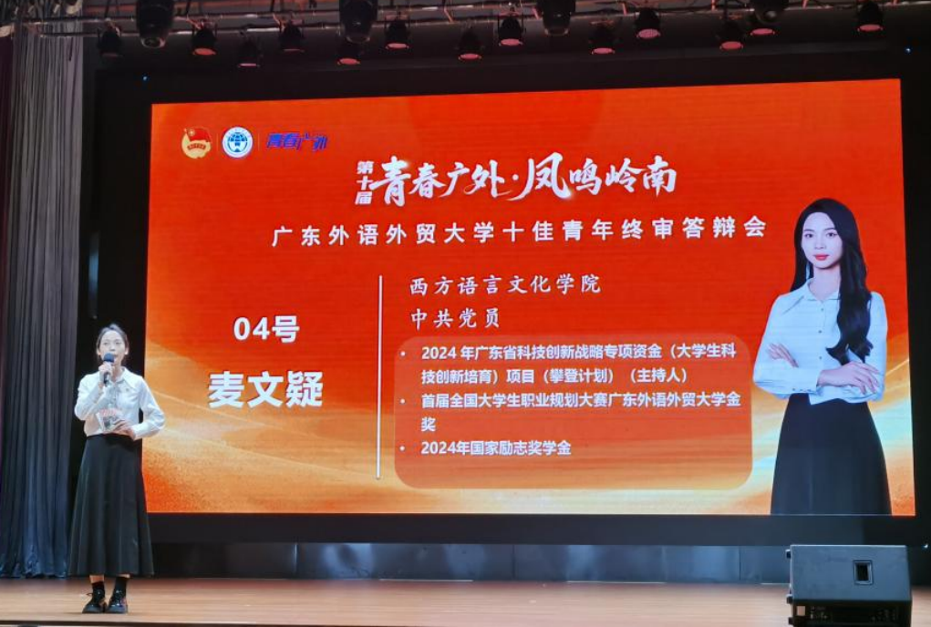 本网讯 4月25日,我校第十届“青春广外·凤鸣岭南”十佳青年终审评选活动在大学城校区B8报告厅举行。经前期学院推荐、材料初审、终审答辩,我院2021级俄语专业麦文疑同学以励志的青年身影、奋斗的青年姿态、奉献的青年精神脱颖而出,获评2025广东外语外贸大学第十届“十佳青年”荣誉称号。