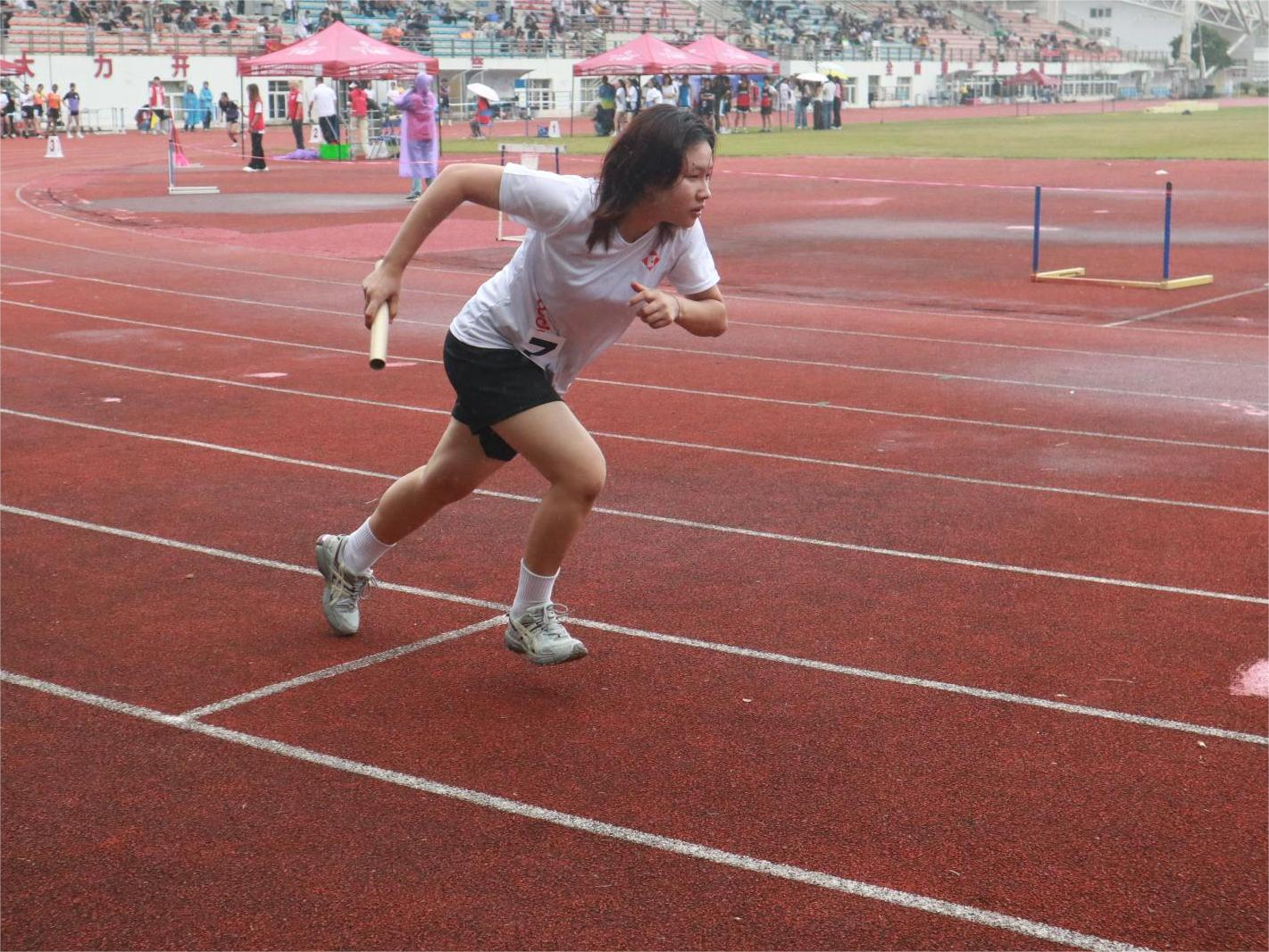 16日上午10:23,混合6×200米接力预决赛开始,黄周雅静同学握紧接力棒,以最快速度冲向交接点,自信满满,胜券在握,最终取得了满意的成绩。