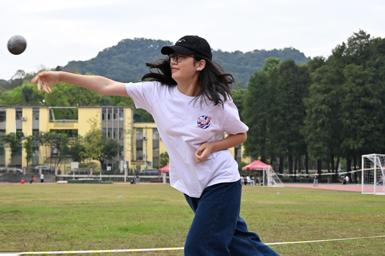 转身,蓄力,推送——铅球在空中划出饱满的弧线。沉闷的落地声,是力量最铿锵的独白。在沉稳而有力的一掷中,法语2301邬颖彤同学、德双2401李梓玲同学和法双2501钟雨珊同学在女子铅球项目中斩获前三!