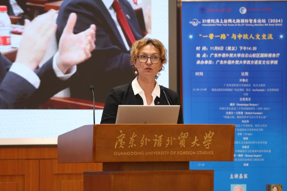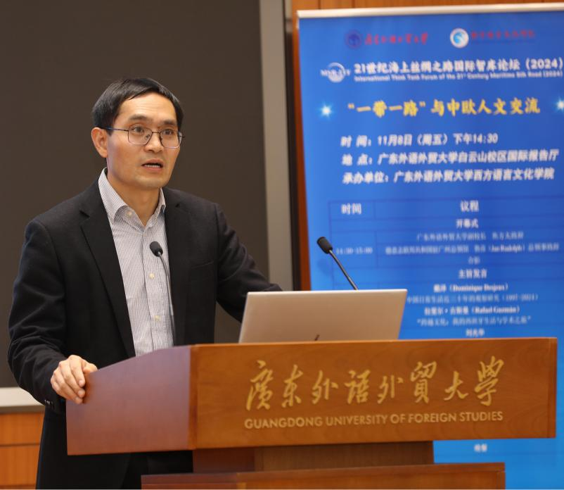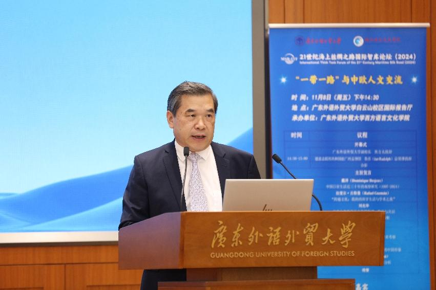 2024年11月,由广东外语外贸大学西方语言文化学院承办的21世纪海上丝绸之路国际智库论坛(2024)“一带一路”与中欧人文交流平行分论坛在广东外语外贸大学白云山校区国际报告厅成功举办。此次论坛汇聚了来自德意志联邦共和国驻穗总领馆、法国巴黎西岱大学、西班牙格拉纳达大学、中国社会科学院、上海外国语大学、兰州大学、广东外语外贸大学等国内外高校及机构的专家学者,围绕“一带一路”与中欧人文交流的主题展开深入交流与探讨。本次论坛涉及中文、法语、德语、西班牙语、葡萄牙语、波兰语等7种语言,西方语言文化学院派出近20人的师生团队,为论坛全程提供同传服务。