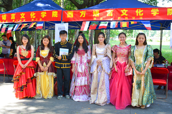 工作人员身穿特色服装展示西语学院风采