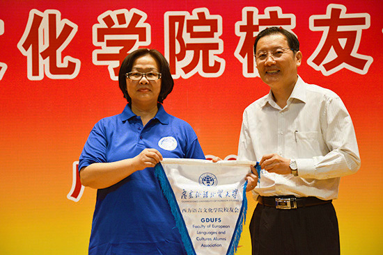 随后,在全体与会嘉宾的见证下,副校长方凡泉向校友会首任会长杨可院长授予广外西语学院校友会会旗。