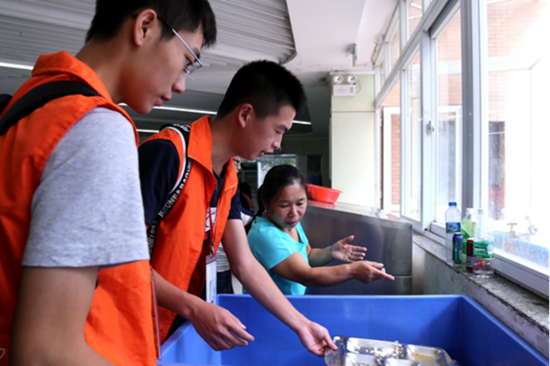 这两天一到午饭和晚饭的时间,西语学院志愿者的身影就准时地出现在学校的第一饭堂、第二饭堂、第三饭堂以及清雅园的一楼。身着橙色马甲的他们,站在饭堂里格外醒目。两人一组搭档配合,负责在倾倒残剩饭菜和回收餐具的指定地点,监督和指引用餐的用餐人员正确分类放好餐具,并将餐具整齐地摞好。他们按照活动前培训的要求和内容开展工作,积极与饭堂阿姨融洽沟通,同时维持着饭堂回收餐具处的秩序。