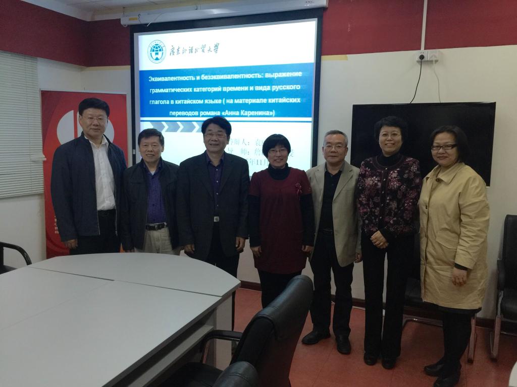 本网讯11月29日下午在第四教学楼俄语中心举行了俄语语言文学博士研究生论文答辩。学位申请人是袁丽霞,指导教师詹德华教授。袁丽霞的毕业论文题目为《等值与不等值:俄语动词时体范畴的汉语表达——以小说<安娜•卡列尼娜>汉语译文为例》。答辩委员会委员有苏州大学周民权教授、北京大学王辛夷教授,以及广东外语外贸大学的杨可教授、李德祥教授和王树春教授,周民权教授任答辩委员会主席。