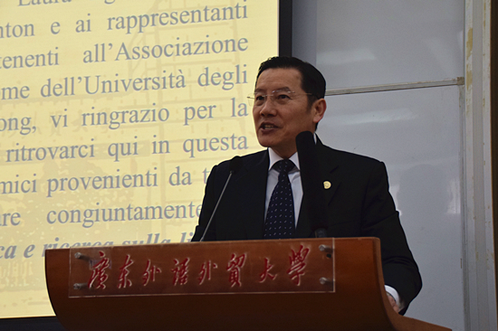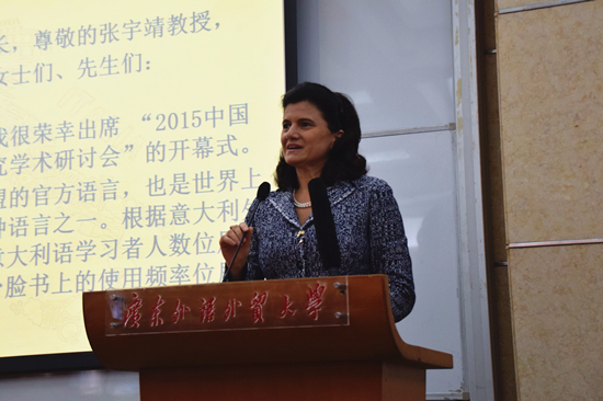 本网讯 2015年12月11日上午9点,2015中国意大利语教学与研究学术研讨会开幕式在广东外语外贸大学第六教学楼B103会议室举行。出席开幕式的领导和来宾有:意大利驻广州总领馆总领事艾古丽女士、广东外语外贸大学副校长方凡泉教授、中国意大利语教学研究会会长张宇靖教授、广东外语外贸大学西方语言文化学院院长杨可教授、副院长杨晓敏教授以及中国意大利语教学研究会各理事单位的教师代表。