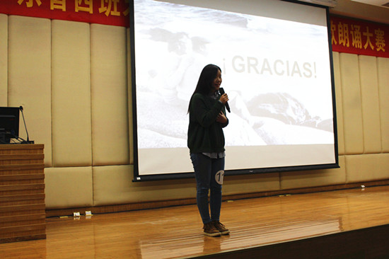 在智利驻广州总领事 Carlos Marín先生朗读开幕词之后,比赛正式开始。来自广东外语外贸大学、中山大学和南国商学院的18组学生依次上场为大家带来聂鲁达的诗歌朗诵。其中中山大学前来参赛的还有以西班牙语为第二语言的英语专业学生,他们饱含深情的朗诵配着低沉婉转的乐曲,将现场的观众和评审带入到了聂鲁达的世界。