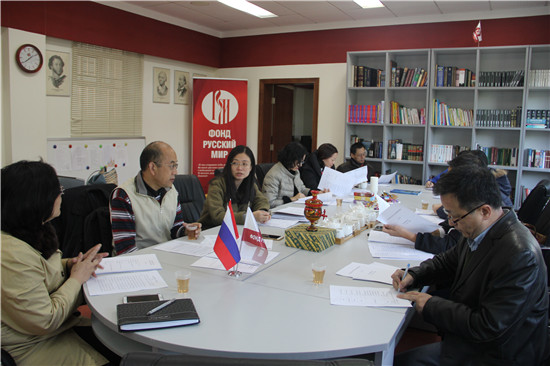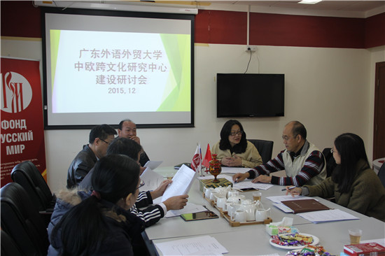 下午两点三十分,广东外语外贸大学“中欧跨文化”研究基地在北校区四教320俄语中心召开了2015年建设研讨会。会议由基地主任杨可教授主持,指导专家英文学院温宾利教授、外文中心张进教授、校科研处李海琳科长以及基地全体成员(除一人在国外访学)出席了会议。