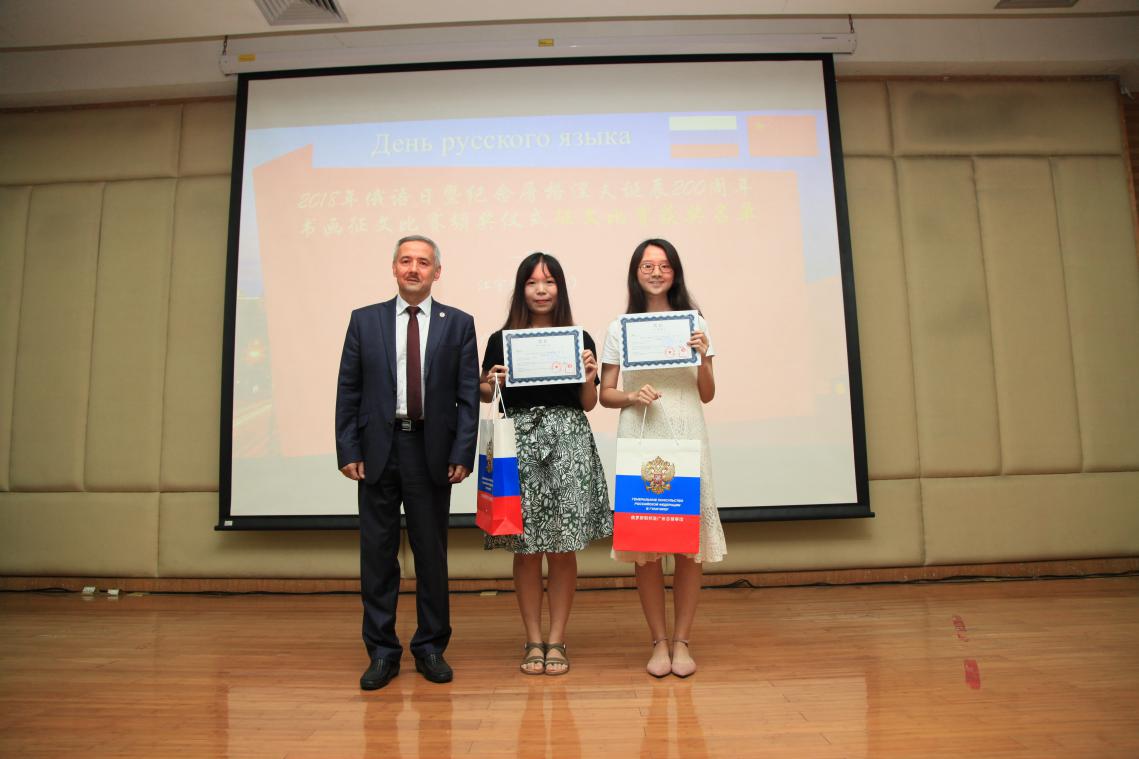 紧接着是激动人心的颁奖仪式。本次大赛收到来自华南地区各高校俄语系学生和中学生的多份征文和书画作品,才华横溢的参赛者们各展其才,通过多种形式表达对俄语的热爱。最终,我校俄语系江宇红同学斩获征文比赛一等奖并赢得俄罗斯旅游大奖。