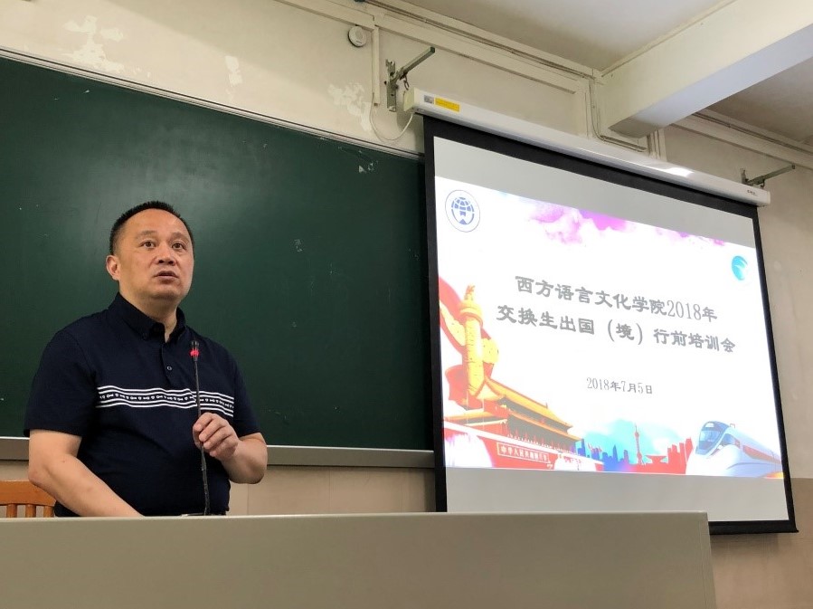 本网讯 2018年7月6日11:30,西语学院2018年交换生出国(境)行前培训会在二教132准时召开。会议由西语学院团委书记王斌龙老师主持,西语学院党委书记方华老师担任主讲人,120余名即将出国(境)交换的2016级本科生出席了本次会议。