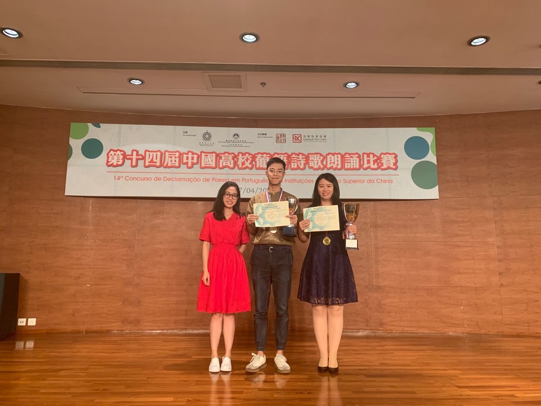 “中国高校葡语诗歌朗诵比赛”每年举办一届,是面向中国大陆及澳门地区葡萄牙语本科学生的专业赛事。经过与来自包括澳门大学,澳门理工学院,圣若泽学院,澳门科技大学,对外经贸大学,湖北大学,中山大学,北师大珠海分校共8所高校的24名选手的激烈角逐,我校学子再创佳绩。