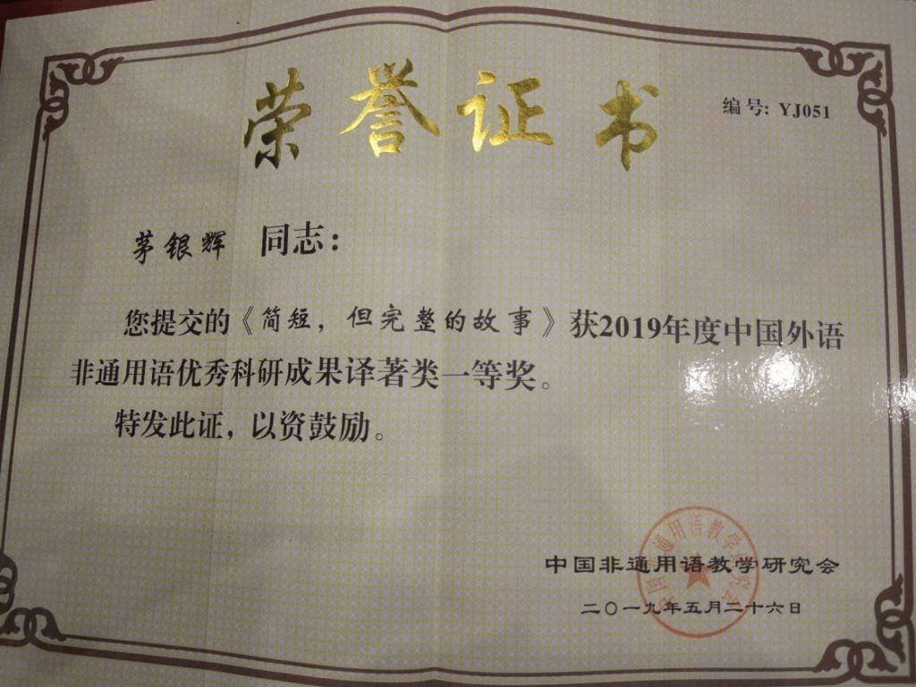 广外波兰语茅银辉教授获奖证书