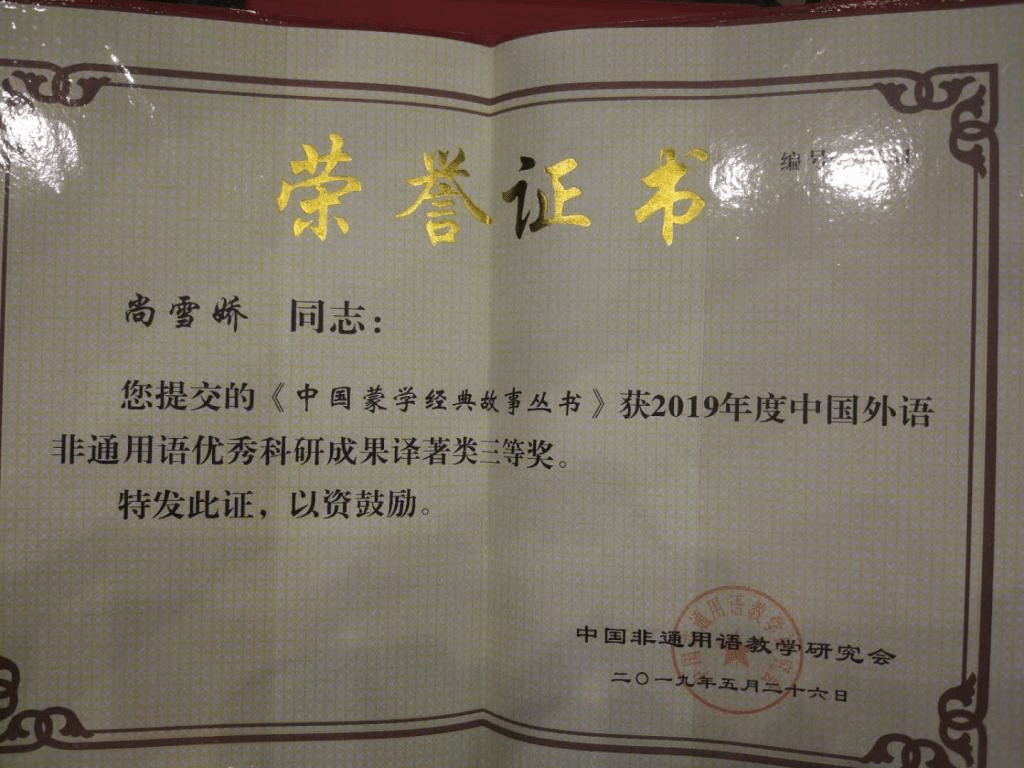 本网讯 近日,中国非通用语教学研究会颁发了“第五届中国外语非通用语优秀科研成果奖”,广外西语学院非通用语教师在优秀科研成果译著类中获得佳绩。波兰语茅银辉教授的《简短,但完整的故事》荣获译著类一等奖;葡萄牙语尚雪娇老师的《中国蒙学经典故事丛书》获译著类三等奖。