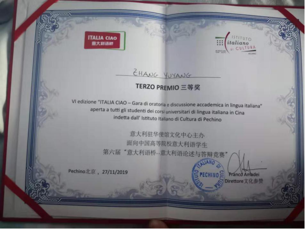 本网讯 11月27日,第六届“意大利语桥”比赛在北京意大利驻华使馆文化处举办,我校西语学院2016级意大利语专业张羽扬代表广外意大利语专业参加此次比赛。