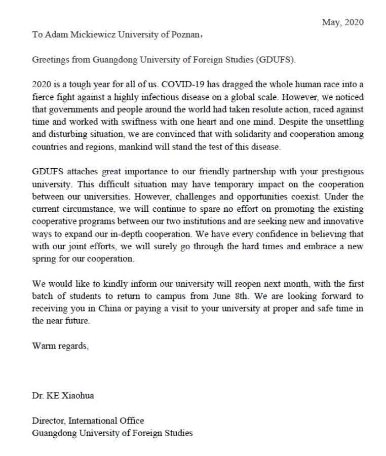 目前,中国疫情已得到有效控制,人民生活回归正轨,而部分欧洲国家疫情也逐步趋于缓和。在此之际,广外国际合作与交流处处长柯晓华女士与波兰合作高校波兹南亚当·密茨凯维奇大学波兰文学和古典文学学院院长托马什•米泽尔凯维奇(Tomasz Mizerkiewicz)教授互致信函,就两校疫情抗击情况交换意见,展望疫情后双方的深度合作。