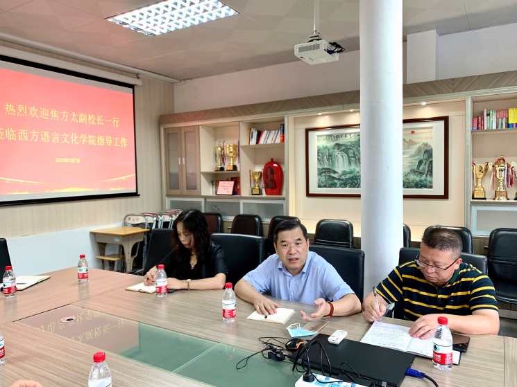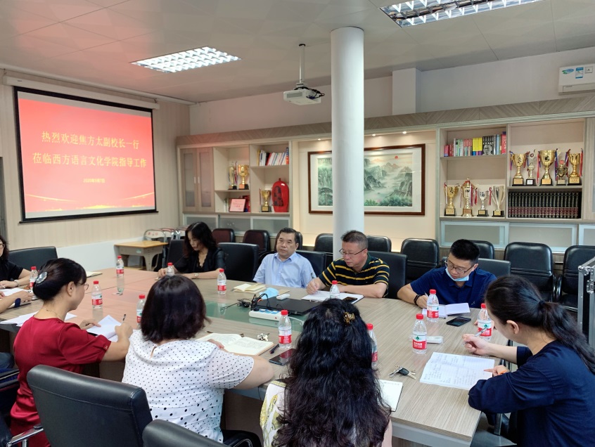 敖湘晖书记首先对焦方太副校长一行的到来表示欢迎和感谢。然后,杨可院长发言,她对学校给予西语学院的重视和支持表示感谢,并汇报了新学期学院开学工作的准备情况和师生返校情况。学院先后召开了党政联席会议、全院教职工大会和教学指导委员会会议落实开学工作要求,尤其强调了要继续落疫情防控的要求,确保正常的教育教学工作。杨可院长表示,对于一流专业的建设和课题的申报,希望继续得到学校领导和相关职能部门的精准帮扶和专项支持,推动一流专业建设再上新台阶。