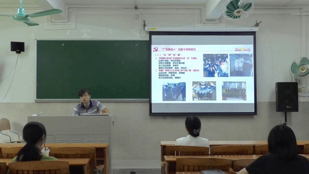 书记“思政第一课”上还邀请了教工第一党支部书记、法语系主任叶剑如老师、法俄研究生联合党支部书记刘爽同学分享自己参加抗疫斗争的经历。教工第一党支部书记叶剑如在课上分享了自己在疫情期间参加广东省委外办战“译”先锋队,以“译”抗“疫”的事迹,并表达了参与抗疫的感想。法俄研究生联合党支部书记刘爽在课上也分享了自己参加白云机场海关一线疫情防控的心得体会,号召广大青年应当做出自己的一份努力。