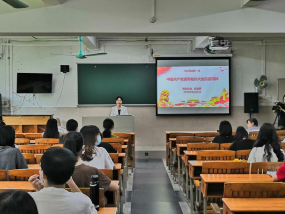 本网讯 2020年9月24日14:00,西语学院在二教132召开书记 “思政第一课”,主讲嘉宾为学院党委书记敖湘晖,参会人员有教师党员、学生党员代表和学院第11期党员发展对象,共60余人参加。敖湘晖书记以“中国共产党领导和伟大的抗疫精神”为题,从中国抗击疫情的艰辛历程出发,回顾了中国抗疫历程的五个阶段;从抗疫大战铸就了伟大的抗疫精神出发,强调了生命至上、举国同心、舍生忘死、尊重科学、命运与共的伟大抗疫精神;从中国共产党在抗疫斗争中强大的领导力出发,展示了党中央领导集体英明的领导力是抗疫取得重大成果的定海神针,党的各级组织高校的组织力执行力是抗疫取得重大成果的坚强保证,广大共产党员和党员干部的先锋模范力是抗疫取得重大成果的中坚力量;从“广外西语人”抗疫斗争有担当,展现了西语师生以“译”抗“疫”的担当。