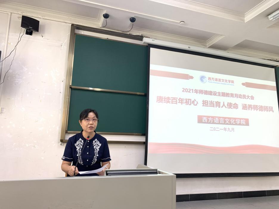 2021年9月5日上午,西语学院在2教114教室召开了主题为“赓续百年初心 担当育人使命 涵养师德师风”的师德建设主题教育月动员大会,学院全体教师共计80余人参与了此次会议。会议由学院党委书记敖湘晖做动员讲话。
